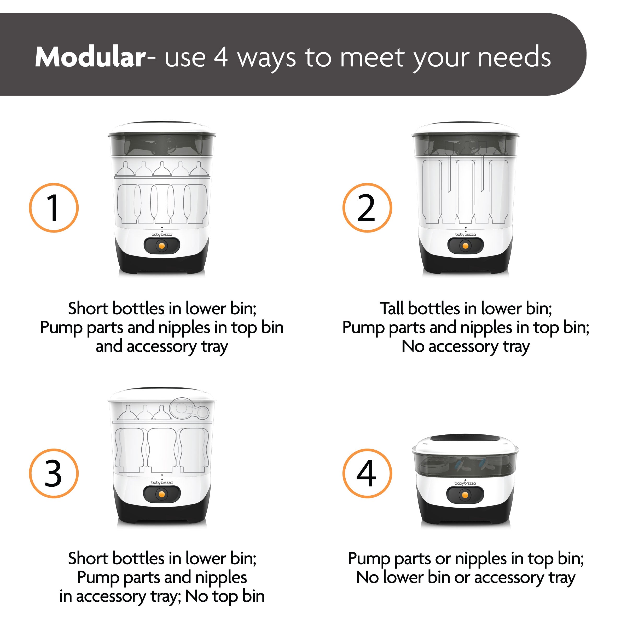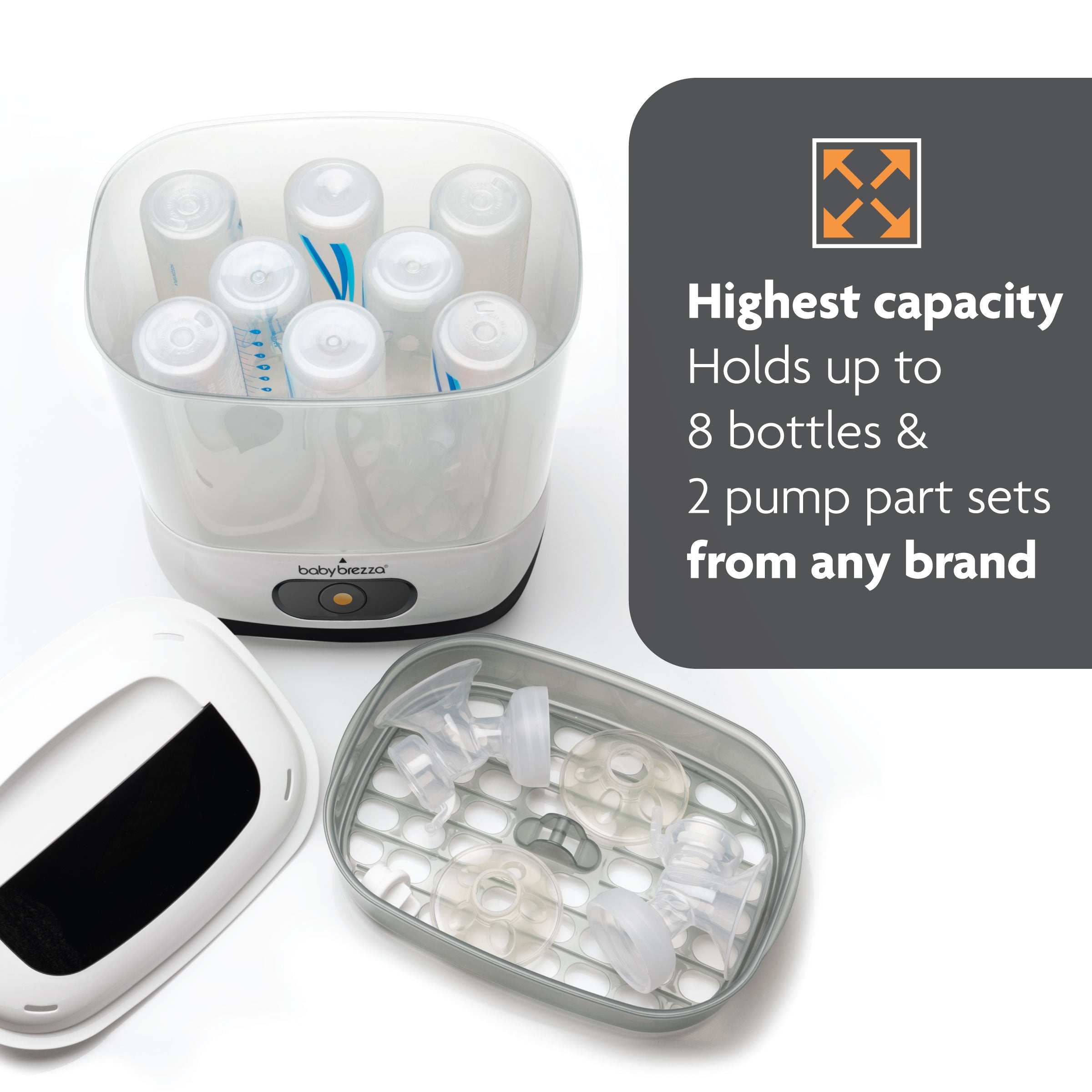 • Largest capacity – Holds 8 bottles. 2 full pump part sets. pacifiers. and accessories from any brand; compatible with glass bottles. wearable pump parts. and other products made from plastic. glass. or silicone