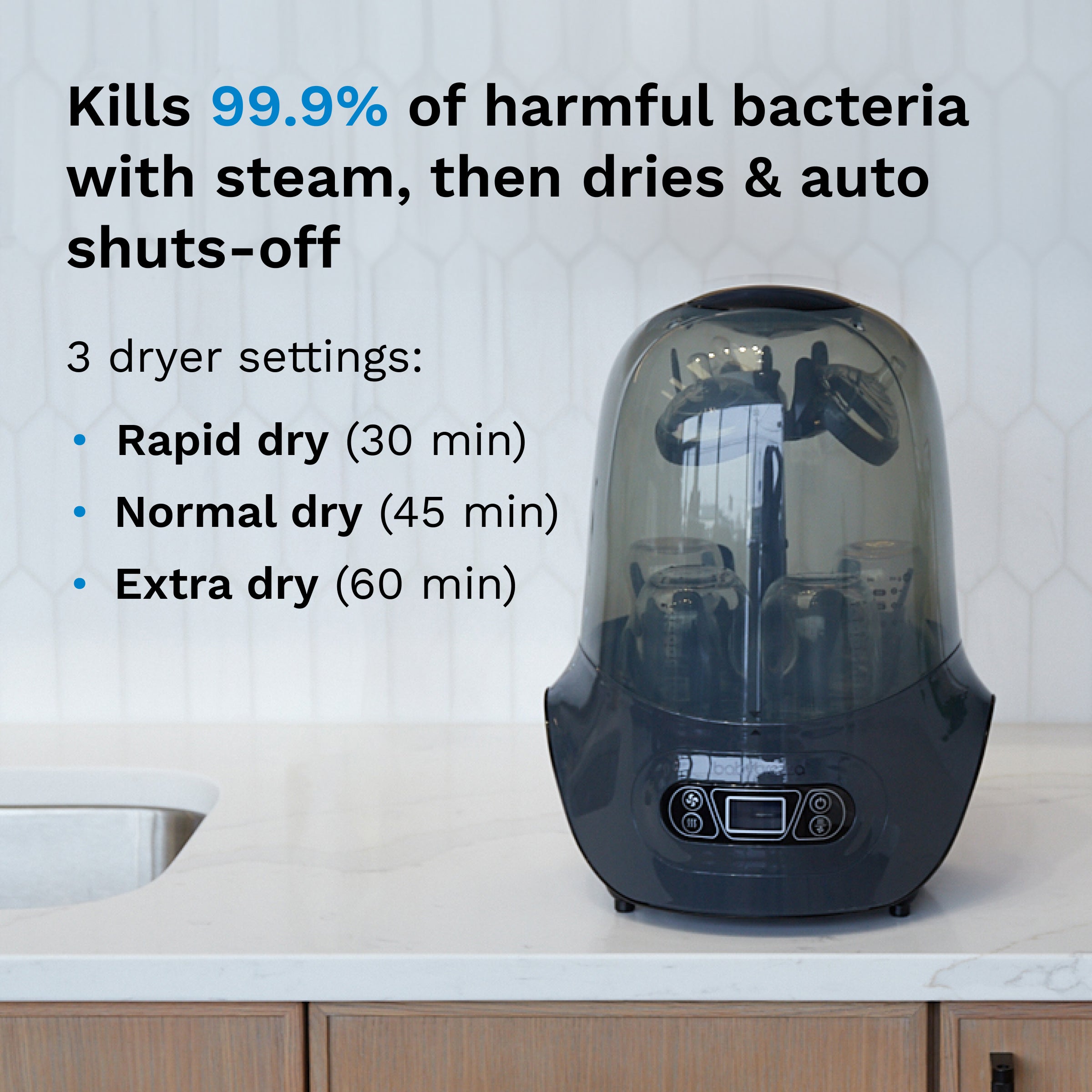 • Automatically sterilizes and dries bottles. pump parts. and accessories in one easy step – Faster. safer. and more hygienic than boiling or air drying