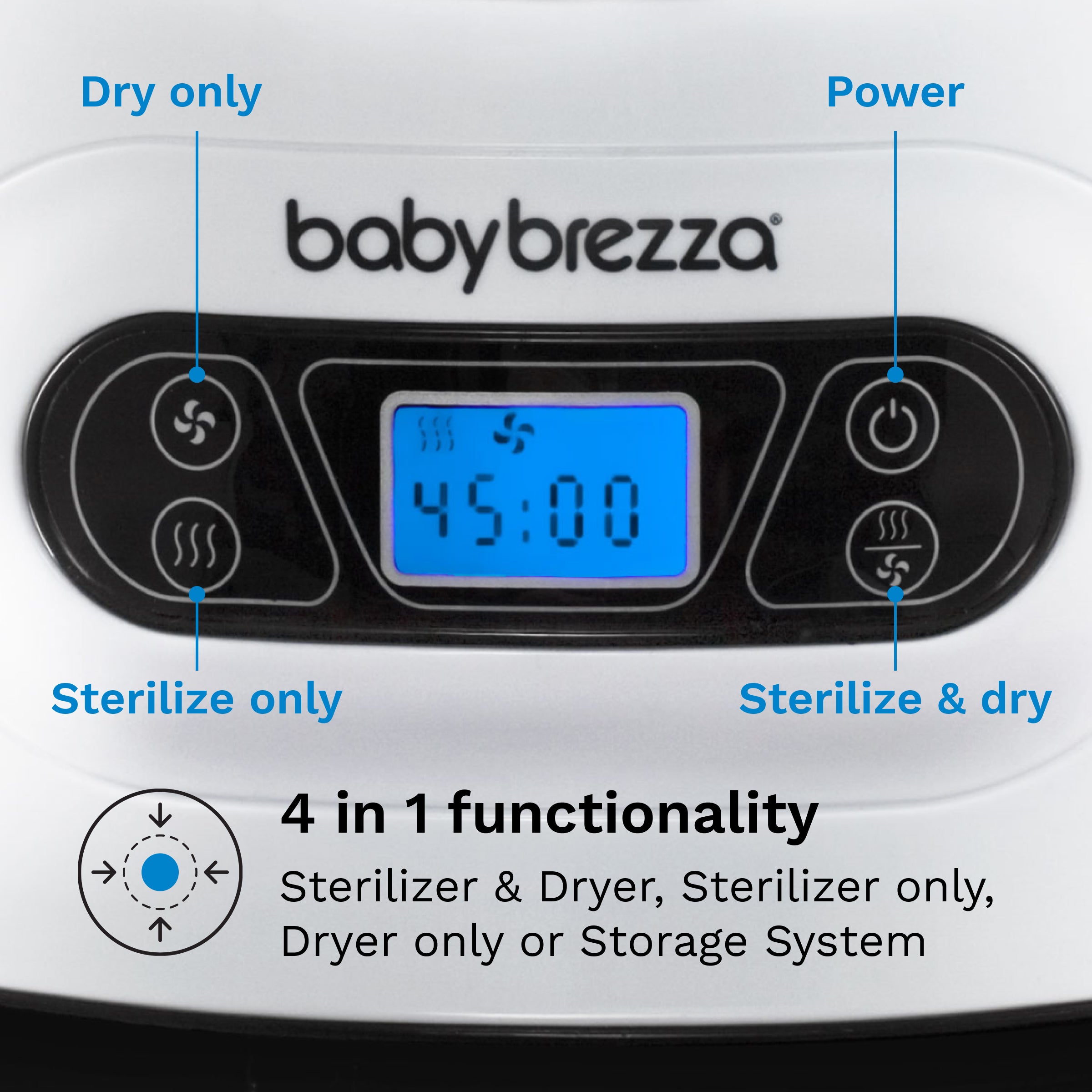 • 4-in-1 functionality and 3 drying cycles – Use LCD control panel to select from 4 functions: sterilize & dry. sterilize only. dry only. or storage rack; and choose from 3 drying cycles: rapid dry (30 min). normal dry (45 min) or extra dry (60 min)